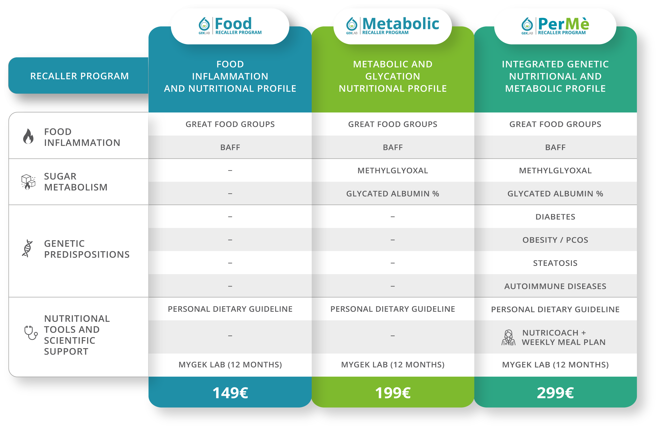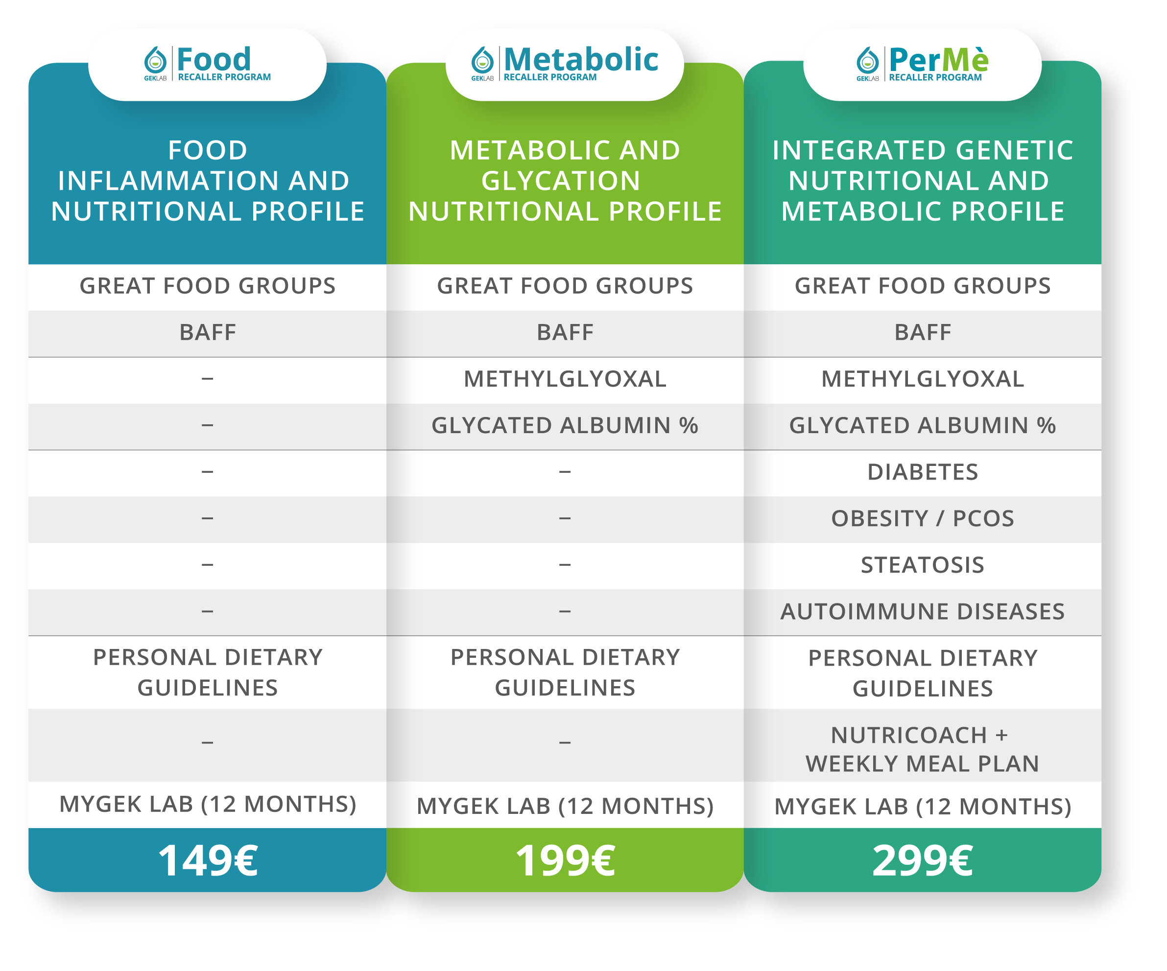 PerMè Recaller Program is the most comprehensive level of the range. It integrates food inflammation and glycation analysis with the study of your genetic predispositions, providing an in-depth and personalized view of your metabolic balance. Based on the results, GEK Lab doctors and specialists develop a tailored nutritional and integrative journey, accompanied by a dedicated video consultation to guide you step-by-step in the practical application of the guidance received.