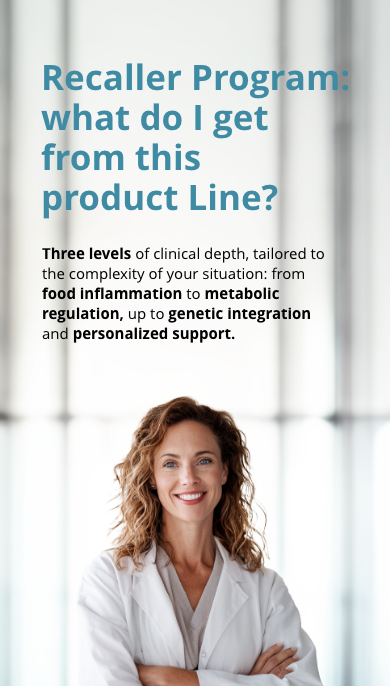 Metabolic Recaller Program is the intermediate level of the range. It integrates food inflammation analysis with metabolism and glycation biomarkers to understand how your body manages sugars and energy. This in-depth assessment allows for the identification of metabolic imbalances that can influence weight, energy, concentration, and cardiometabolic risk, providing more structured and targeted nutritional and integrative guidance.
